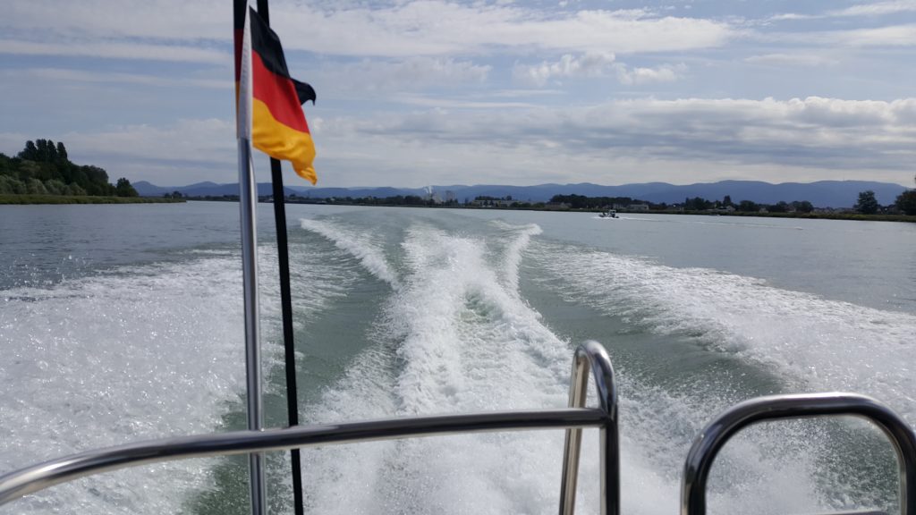 Da der Anker in einem unwegsamen Gelände lag, schifften wir uns in Greffern auf unserem Bergungsboot ein. Das Boot, die Nimbus ist 11m lang und hat einen Motor mit 2x270PS, es bietet gut Platz für 3-4 Tech-Taucher und hat eine Außenplattform aber leider keinen Lift!! Anregung an unsern „Teufel`s“ Skipper. Nach eine Fahr von 20 min fuhren wir in den kleinen Kanal ein. Eine kurze Biegung und der See machte vor uns auf. Hier ankerten einige Boote sowie 4 zusammen vertäute Boote. Das war unser Ziel.