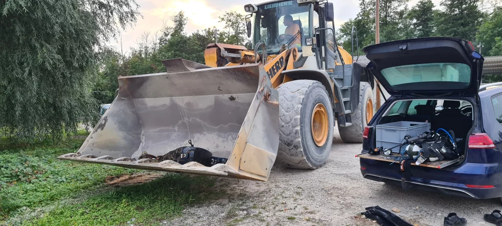 Die Testlampen wurden angeschaltet und abtauchen. Wie seit Wochen schlechte Sicht auf den ersten 10 Metern. Dann machte der Baggersee nur leicht aus so das wir die Leistung der Lampen noch nicht so testen konnten. Der Motor sollte in einer Tiefe von 21m liegen. Nach ca. 20 Minuten fand das Tauch-Team den Motor. Mit Leine und Hebesäcken brachte das Tauch-Team den Motor sicher an die Wasseroberfläche. An Land wartete schon der Bagger um den Motor die Böschung hoch zu holen.