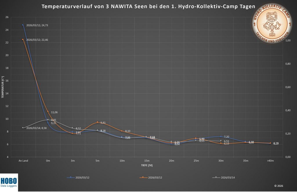 Die Messdaten vom März 2026 sind ein Lehrstück in Sachen physikalischer Verzögerung. Während wir an Land bei 24,73 °C im T-Shirt schwitzten, blieb der See im Wintermodus. Das Wasser schert sich nicht um kurze Hitzeperioden. Die thermische Trägheit der Wassermasse ist gewaltig. Die Sprungschicht war nur ein schwaches Flüstern. Ab 20 Metern Tiefe glichen sich die Kurven aller Seen fast deckungsgleich an. Der See speichert die Kälte des Winters wie ein Tresor.